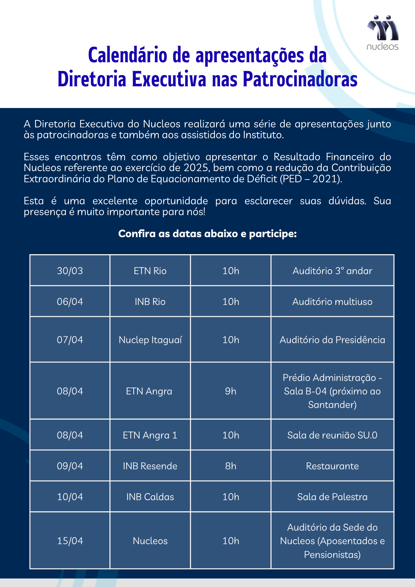 CONVITE: Calendário de apresentações da Diretoria Executiva nas Patrocinadoras Categories: Comunicados, Notícias