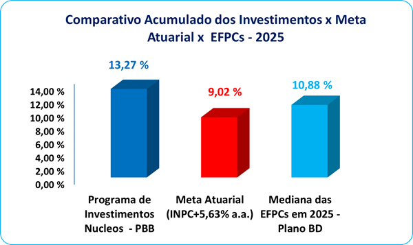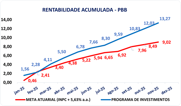 O Nucleos finalizou o mês de novembro de 2025 com resultados positivos em todos os seus Planos de Benefícios, superando as metas estabelecidas para o período. O Plano Básico de Benefícios (PBB) registrou rentabilidade de 1,11% no mês, novamente acima da meta atuarial de 0,49%. No acumulado entre janeiro e novembro, o plano alcançou a rentabilidade de 13,27%, frente à meta atuarial de 9,02% (INPC + 5,63% ao ano).