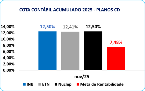 Todos os planos de Contribuição Definida (CD-INB, CD-Eletronuclear e CD-Nuclep) também apresentaram rentabilidades positivas no mês, de 1,03%%, 1,02%% e 1,01%, respectivamente, superando a meta de 0,36%. No acumulado do ano, os planos continuam registrando desempenho consistente e acima da meta de rentabilidade estabelecida, conforme exposto no gráfico abaixo.