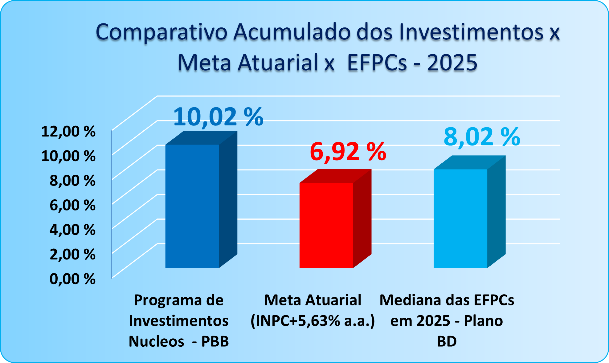 O desempenho reflete a assertividade da estratégia de alocação de ativos, orientada pela redução da volatilidade e pela busca de melhor relação risco-retorno. No período, o PBB também superou a mediana das EFPCs monitoradas pela Aditus Consultoria (8,02%), com base em uma amostra de 138 entidades.