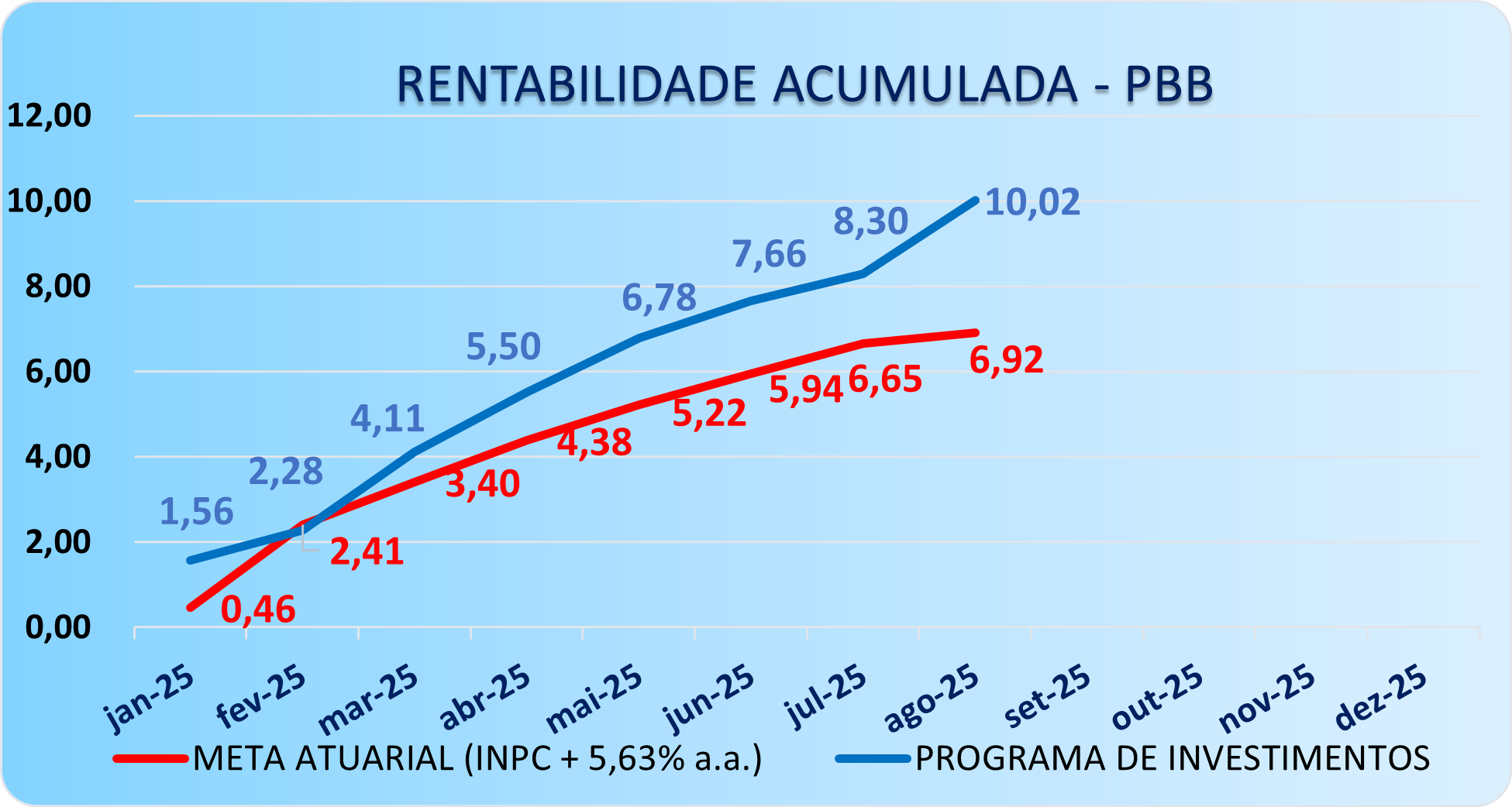 “A decisão de adotar uma postura mais conservadora, com marcação na curva das NTN-Bs, contribuiu para reduzir significativamente a volatilidade e atravessar períodos de maior incerteza com menor impacto, como ocorreu em fevereiro e julho, quando o Ibovespa recuou -2,64% e -4,17%, enquanto o PBB manteve desempenho positivo de 0,71% e 0,59%. Essa estratégia equilibrada também nos permitiu capturar os momentos de alta, mantendo exposição à renda variável — como em agosto, quando o Ibovespa valorizou 6,28%, impulsionando a rentabilidade do PBB para 1,59%, bem acima da meta atuarial do mês de 0,25%, influenciada pela deflação do INPC de -0,21%.”, avalia André Mignani, Diretor-Presidente do Nucleos.