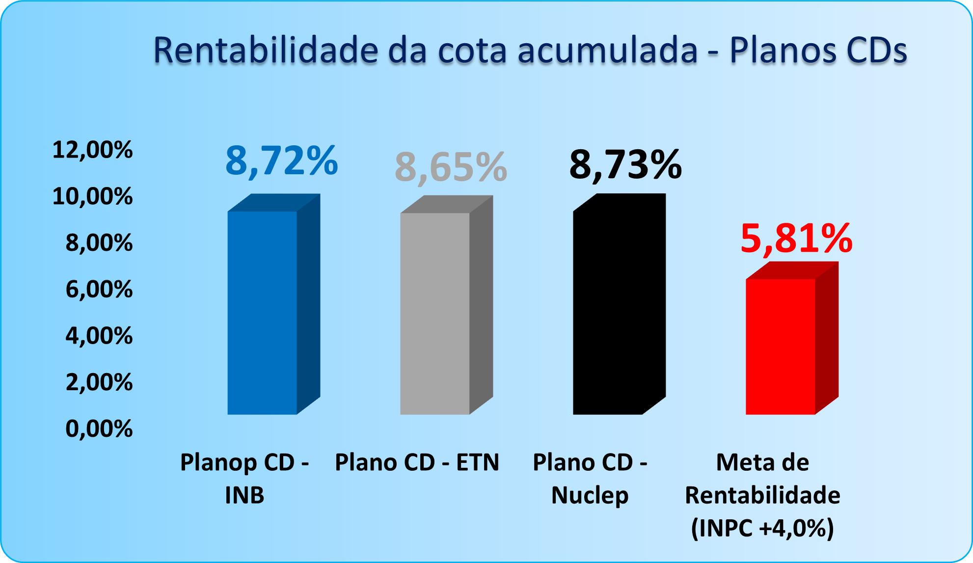 Os planos de Contribuição Definida (CD-INB, CD-Eletronuclear e CD-Nuclep) também registraram rentabilidades positivas no mês (1,12%, 1,11% e 1,11%, respectivamente) todas acima da meta de rentabilidade de 0,12%. No acumulado do ano, os planos CDs seguem apresentando desempenho consistente e superior às metas estabelecidas.