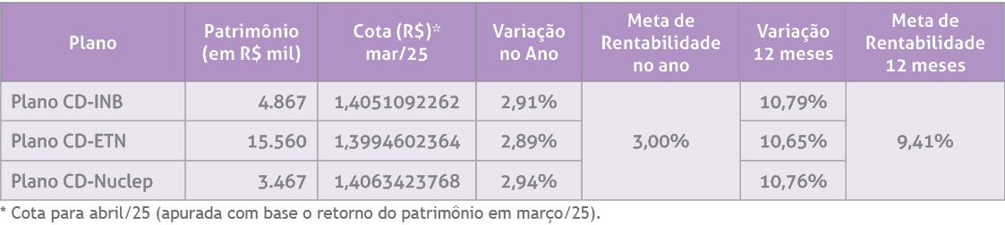 Em relação aos Planos CD – INB, CD – Eletronuclear e CD – Nuclep, estes registraram rentabilidades positivas de, respectivamente, 0,91%, 0,90% e 0,94%, todas superiores à meta de rentabilidade do mês, de 0,84%. No acumulado do ano, no 1° trimestre, os três planos também apresentaram desempenho positivo, embora levemente abaixo da meta de rentabilidade de 3,00%. O Plano CD – INB acumulou 2,91%, o CD – Eletronuclear, 2,89%, e o CD – Nuclep, 2,94%.